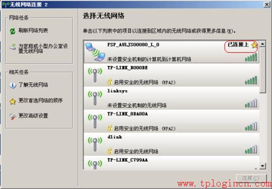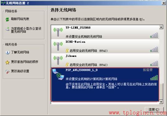開(kāi)啟PSP的WIFI開(kāi)關(guān):WLAN。進(jìn)入游戲,選擇聯(lián)網(wǎng)模式。打開(kāi)電腦的網(wǎng)絡(luò)連接---右鍵點(diǎn)擊無(wú)線(xiàn)網(wǎng)絡(luò)連接,選擇“查看可用的無(wú)線(xiàn)連接”,在當(dāng)前的可用的網(wǎng)絡(luò)列表中掃描到PSP,點(diǎn)擊連接,連接成功后能夠看到如下信息: