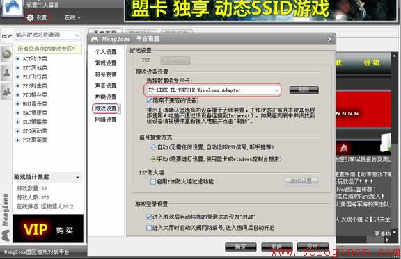 對(duì)戰(zhàn)平臺(tái)有很多,本例以盟區(qū)對(duì)戰(zhàn)平臺(tái)為例,首先進(jìn)入http://www.mengzone.com/網(wǎng)站,免費(fèi)注冊(cè)一個(gè)用戶(hù)名和昵稱(chēng),昵稱(chēng)就是你在游戲中的名字。然后下載游戲平臺(tái)客戶(hù)端軟件,在本機(jī)上安裝好。打開(kāi)桌面上的客戶(hù)端,輸入剛注冊(cè)的用戶(hù)名和密碼,然后選擇登錄服務(wù)器,確定后就進(jìn)入了游戲主界面,在首頁(yè)中點(diǎn)擊游戲設(shè)置,在接收設(shè)備設(shè)置上選擇我們安裝的無(wú)線(xiàn)網(wǎng)卡(TP-LINK TL-WN721N wireless Adapter)。如圖: