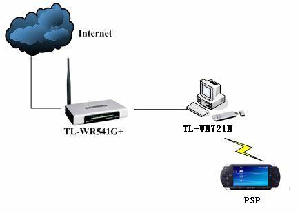 電腦通過有線連接已經(jīng)可以訪問Internet,PSP通過連接安裝在電腦上的無線網(wǎng)卡,實(shí)現(xiàn)Internet聯(lián)網(wǎng)游戲?qū)?zhàn)。