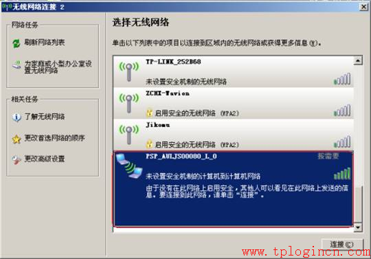 開啟PSP的WIFI開關(guān):WLAN。進(jìn)入游戲,選擇聯(lián)網(wǎng)模式。打開電腦的網(wǎng)絡(luò)連接---右鍵點(diǎn)擊無線網(wǎng)絡(luò)連接,選擇“查看可用的無線連接”,在當(dāng)前的可用的網(wǎng)絡(luò)列表中掃描到PSP,點(diǎn)擊連接,連接成功后能夠看到如下信息: